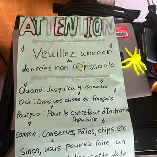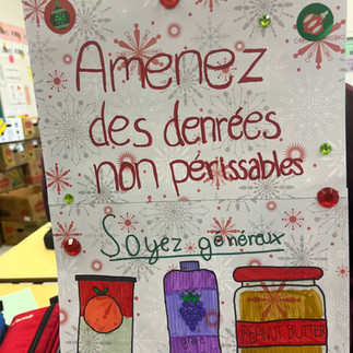 Dès maintenant, et jusqu’au jeudi 4 décembre, il sera possible d’apporter de la nourriture qui se conserve. Vous trouverez des boîtes dans votre classe de français. Il sera possible d’y mettre différents types d’aliments, tels que des boîtes de conserve, du riz, des pâtes alimentaires, des céréales et du gruau, de la farine, des collations à longue conservation, des sauces en pots scellés, des craquelins, du sirop d’érable ou du miel, etc.